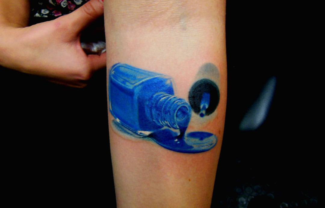 This one is Incredible! An electric blue nail polish done in a realistic style. The spill effect here and the small details like the light reflection on the polish make this a really eye-catching tattoo.