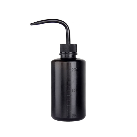 Using the spray bottle during the tattoo process is important for both the client and the artist. Filled with green surgical soap and water, it is sprayed onto the skin during the tattoo process. The artist then uses tissue paper to gently wipe any ink residue, plasma and blood away from the skin to make sure they don't interfere with the artistic process. One gallon of surgical soap concentrate is diluted to make up to ten gallons of solution, enough for hundreds of tattoos on happy clients. The alcohol content in the soap also helps to ensure continued hygiene during the process, when blood and plasma are being released from the perforations in the skin.