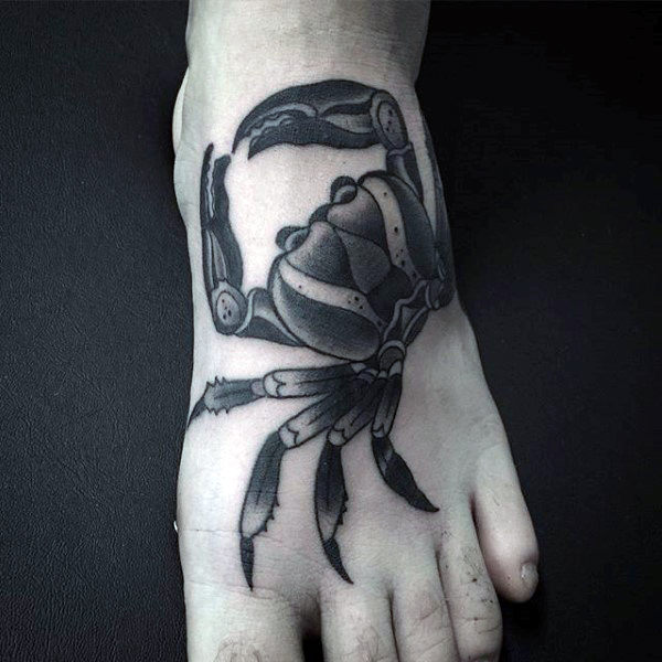 A bold black and grey Cancer themed foot tattoo. The placement of this piece is really nice. Artist unknown.