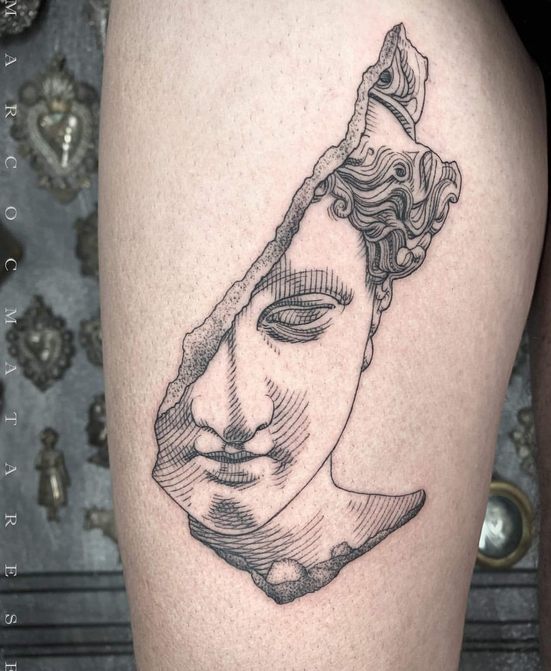 Done by Marco Matarese, this Roman style statue is incredible. Instead of shading this, he’s used single lines to etch in a shaded effect which is a brilliant touch.