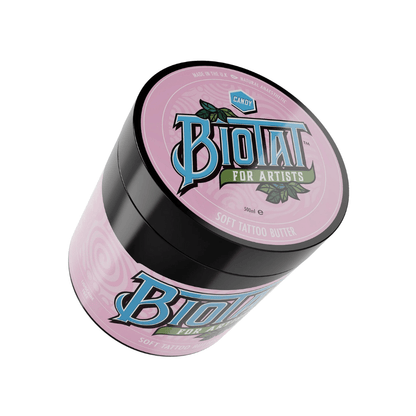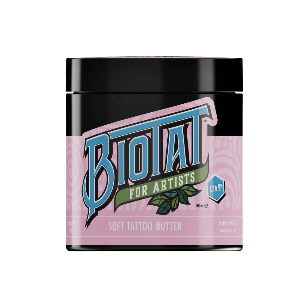 Biotat Candy is a naturally numbing, soft tattoo butter made for use during and after tattooing. Blended with shea and mango butters, coconut oil, and grape seed oil, it helps calm inflammation and reduce redness – with no lidocaine or artificial colourants.