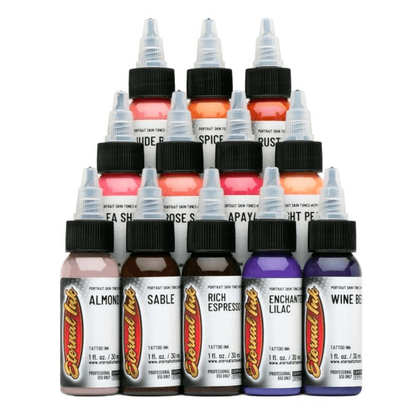 Designed especially complex portrait and pin-up work in mind, Eternal Ink have developed a range of delicate flesh and skin tones with this type of tattooing at the forefront. Specially selected pigments have been carefully blended to give tattoo artists the ideal range of tones to create stunning portraits. With the rising trend for photo-realistic tattoos, it is becoming increasingly competitive. Get the professional edge in the industry by choosing to use one of the most popular ink producers in the world, Eternal Inks. Dedicated to using organic, natural pigments in their inks, you can be assured that you will always receive a high quality that you can rely on and your customers will always be able to trust. This unique portrait focused set includes 12 newly created colours: Almond, Enchanted Lilac, Light Peach, Nude Blush, Papaya, Rich Espresso, Rose Satin, Rust, Sable, Sea Shell, Spice, Wine Berry. These freshly blended colours will allow you to perfect the art of both portrait and pin up tattoos with a retro finish as these colours are specially selected for their delicate tones. It can be difficult to create a realistic flesh or skin colour if you only have a limited range of colours to work with. Take the stress out of colour mixing by picking up one of these great kits from Eternal Ink and ensure you great the perfect colour to work with every time. It also means you will not need to try and replicate a custom ink colour you created in a previous session when returning to either complete or touch up a tattoo.