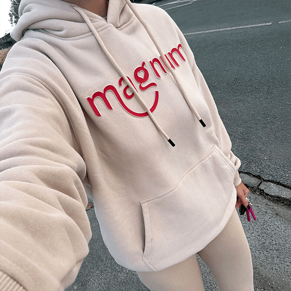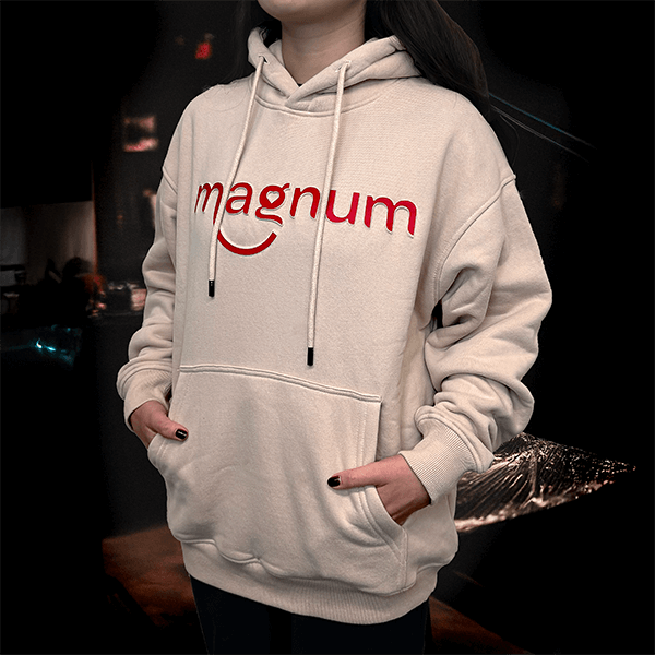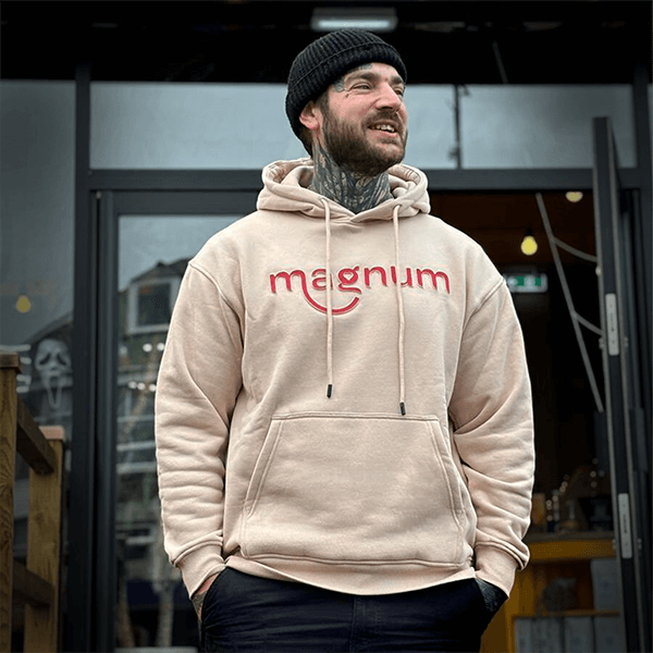 The Magnum logo hoodie is made from ultra-soft, high-quality fabric for everyday comfort. It features a bold red raised Magnum logo across the chest, adding contrast against the soft ivory fabric. With a regular fit, this hooded jumper keeps you warm and comfortable throughout the day.