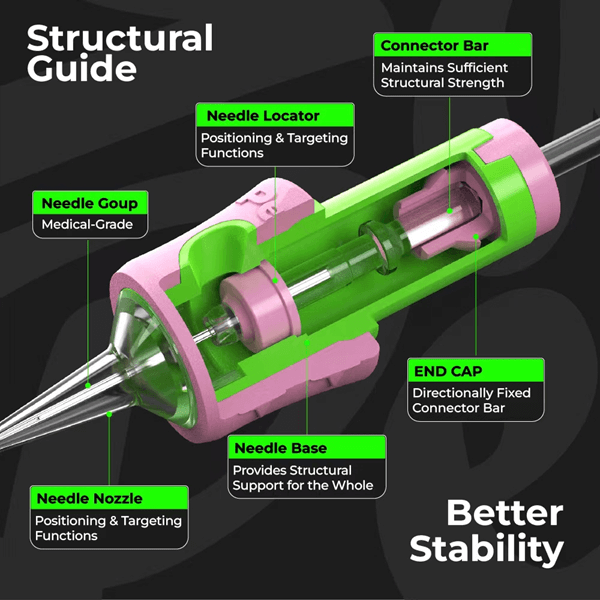 The innovation doesn't stop there. Peach Tattoo Cartridges incorporate a targeted silica gel membrane that is uniformly stressed to prevent deviation from the intended area, maintaining the needle's path for consistent and accurate results. Additionally, the anti-shaking end provides further stability, allowing for meticulous detail work and enhancing overall precision.