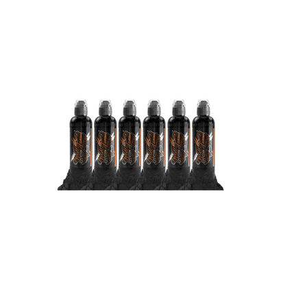World Famous Tattoo Ink's Dark Water Shading Inks, created by renowned black and grey realism artist Jose Perez Jr, is named after his Illinois-based studio. This set includes a range of black and grey wash shades, organized from darkest to lightest, tailored for achieving stunning gradients and depth in black and grey tattoo work.
