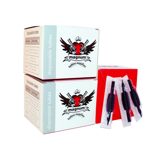 The professional disposable tips from Magnum Tattoo Supplies are must-have items for any quality tattoo parlour. Delivered in boxes of 20, they even come with grips included! The 1” firm rubber grips are comfortable for tattoo artists to hold, even when inking complex or large designs. Plus, the grips have a non-slip, ribbed design that helps provides excellent hand control during sessions.