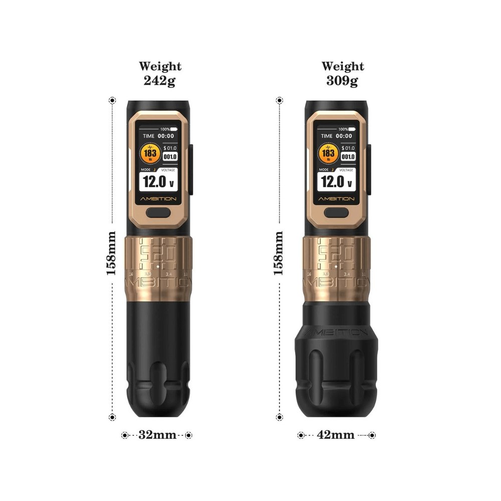Two grip options are included: a 32mm lighter grip to help reduce hand fatigue, and a 42mm heavier grip for added stability and control. Available in black or gold, and supplied in an Ambition zip case, the Soldier Pro 520 is a solid option for artists who want power, flexibility, and battery longevity in one setup.