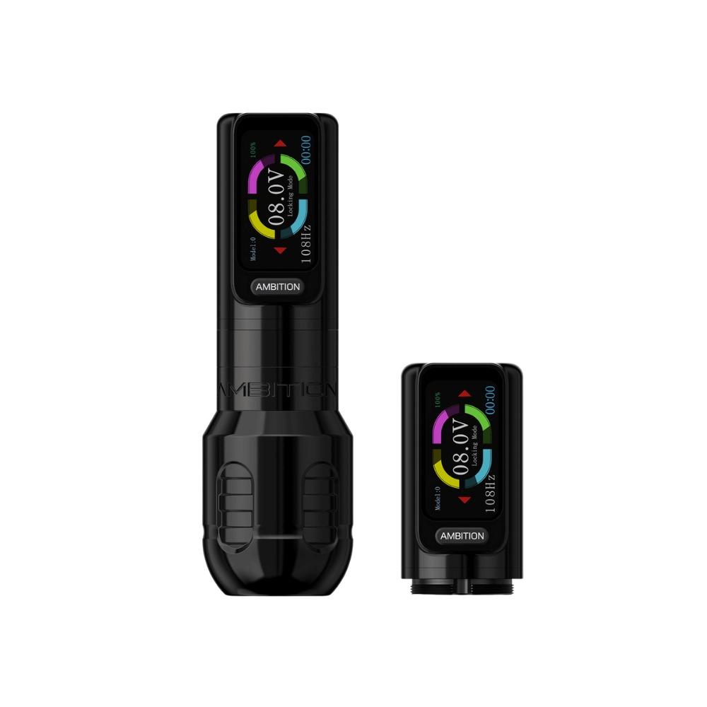 The Ambition Zetton is a direct drive wireless tattoo pen machine built from aluminium alloy, designed for both lining and shading with low vibration and quiet operation. It features a powerful brushless motor with a 3.8mm stroke cam (plus a 3.4mm cam included), offering strong, consistent performance with minimal resistance.
