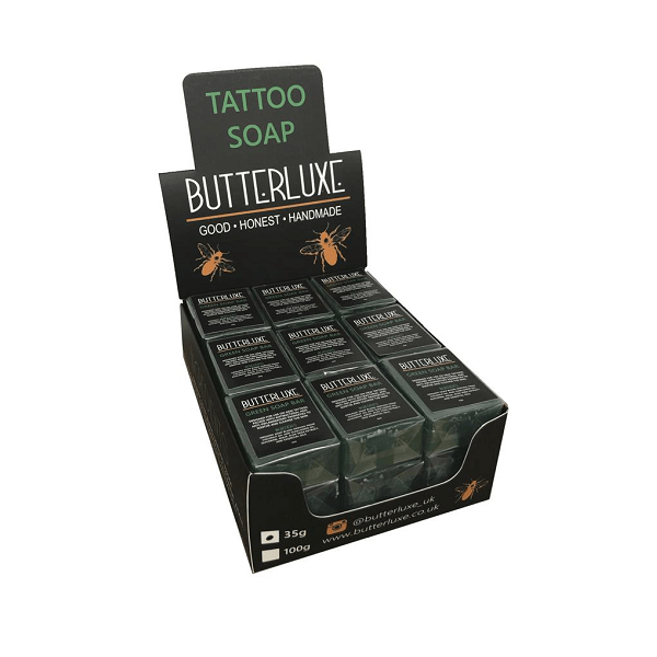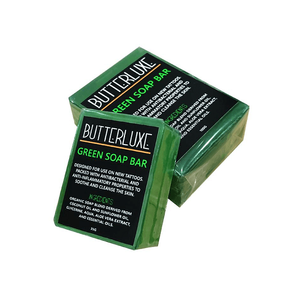 Butterluxe Green Soap Bar is designed for use on new tattoos. Packed with Antibacterial and Anti-inflammatory properties to soothe and cleanse the skin.