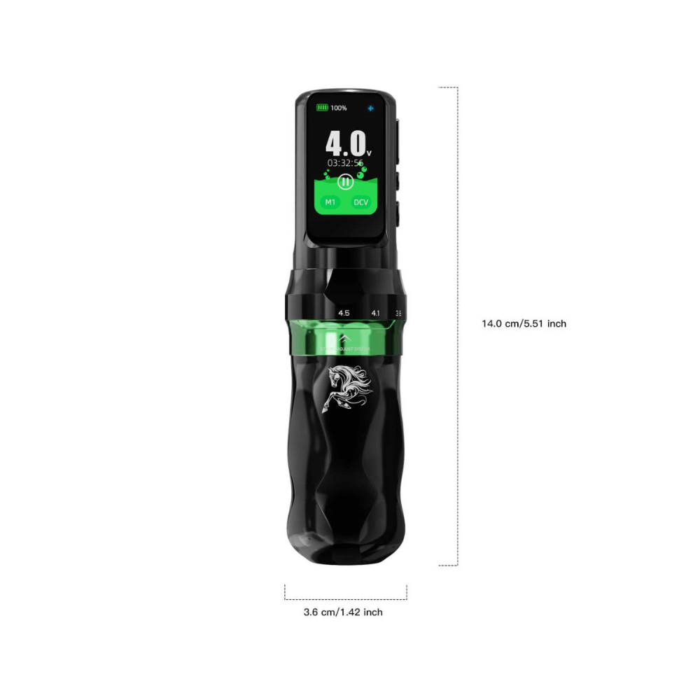 The Dragonhawk Mast Fold Pro - Year of the Horse Edition is a wireless tattoo pen machine designed to offer flexibility, stable output, and long working time across a wide range of tattooing styles. Powered by the upgraded Mcore-C4 motor, it delivers increased output while remaining smooth and controlled, particularly at longer stroke settings.