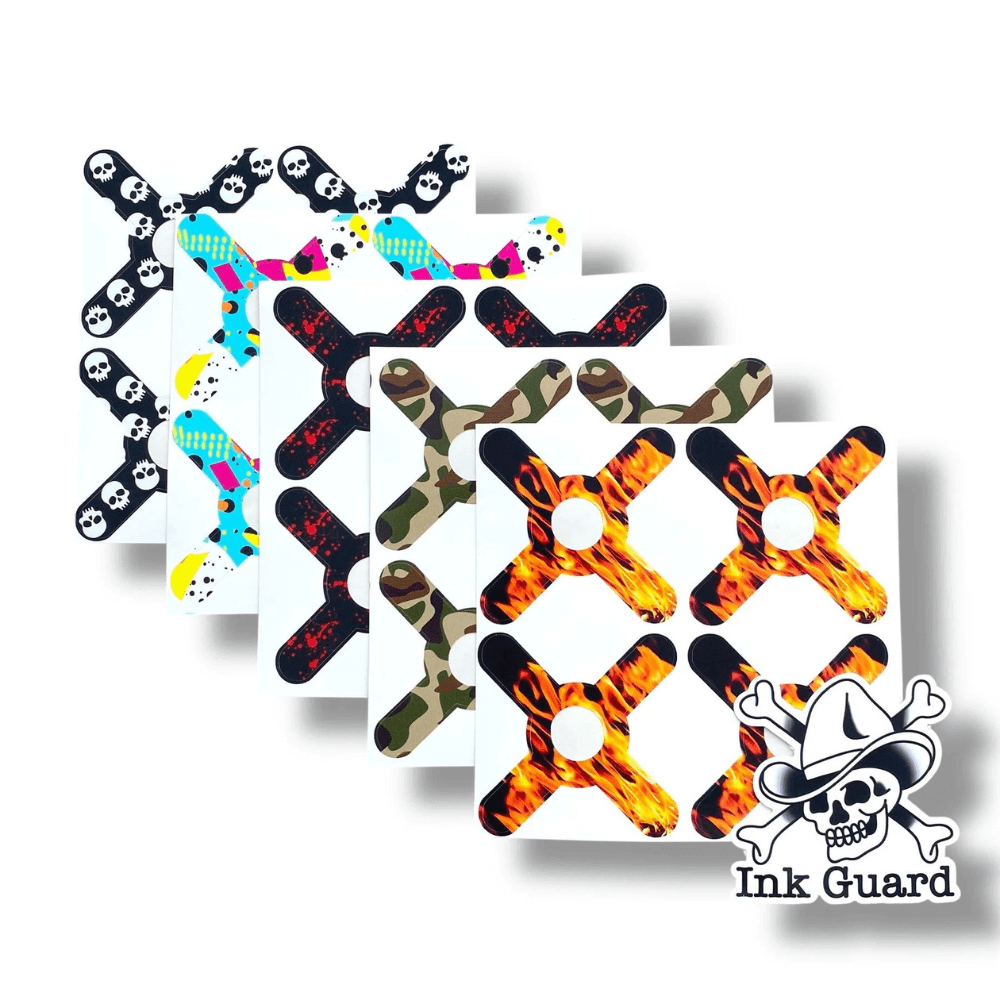 Ink Guard machine stickers are made to sit snugly around the cartridge socket of your tattoo machine or grip, helping protect it from ink, blood, and plasma during tattooing. They offer a simple alternative to cling film and barrier film that can tear or loosen when switching cartridges mid-session.