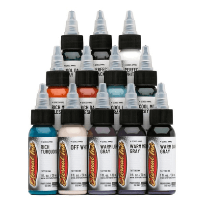 This range of inks is designed by Mike Devries and Mario Rosenau and contains 12 special colours such as Rich Turquoise, Off White, Warm Dark Grey, Cool Dark Grey and many more. Ideal for portrait tattoo work, realism and monochromatic tattoos. Lets you choose from warm and cool tones and is offered in light, medium and dark tones to give you a complete balance of colours for your tattoo.