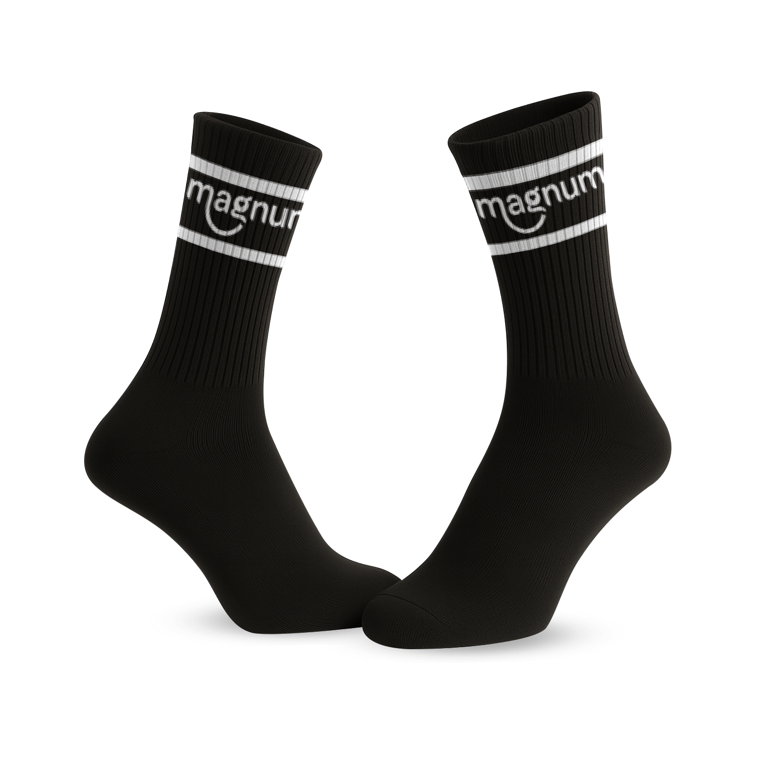 Available in black, white, or soft ivory (with the option of a red or gold Magnum “m” logo), these socks keep things simple and easy to pair with any outfit or studio setup. The crew length provides a secure fit, while the cotton-rich blend offers comfort without feeling flimsy.