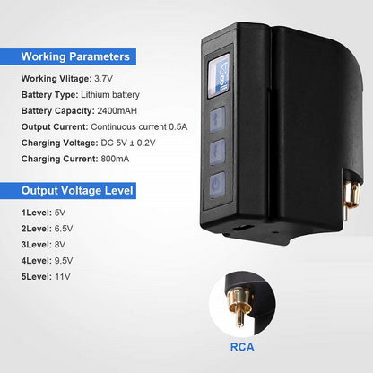 The Portable Battery Power Supply is a 2400mAh capacity lithium battery which powers your tattoo machine. It provides an and efficient performance.